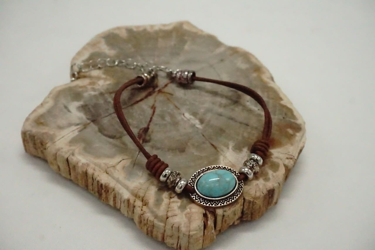 Bracelet en cuir marron avec une pierre en turquoise ovale