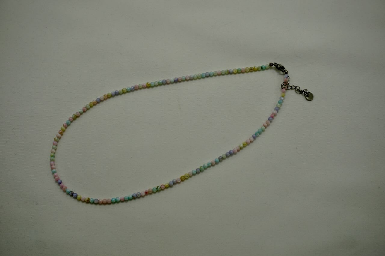 Ce bijou en pierres est un collier en Rhyotique qui est une pierre naturelle semi précieuse. Les perles sont rondes avec des nuances.