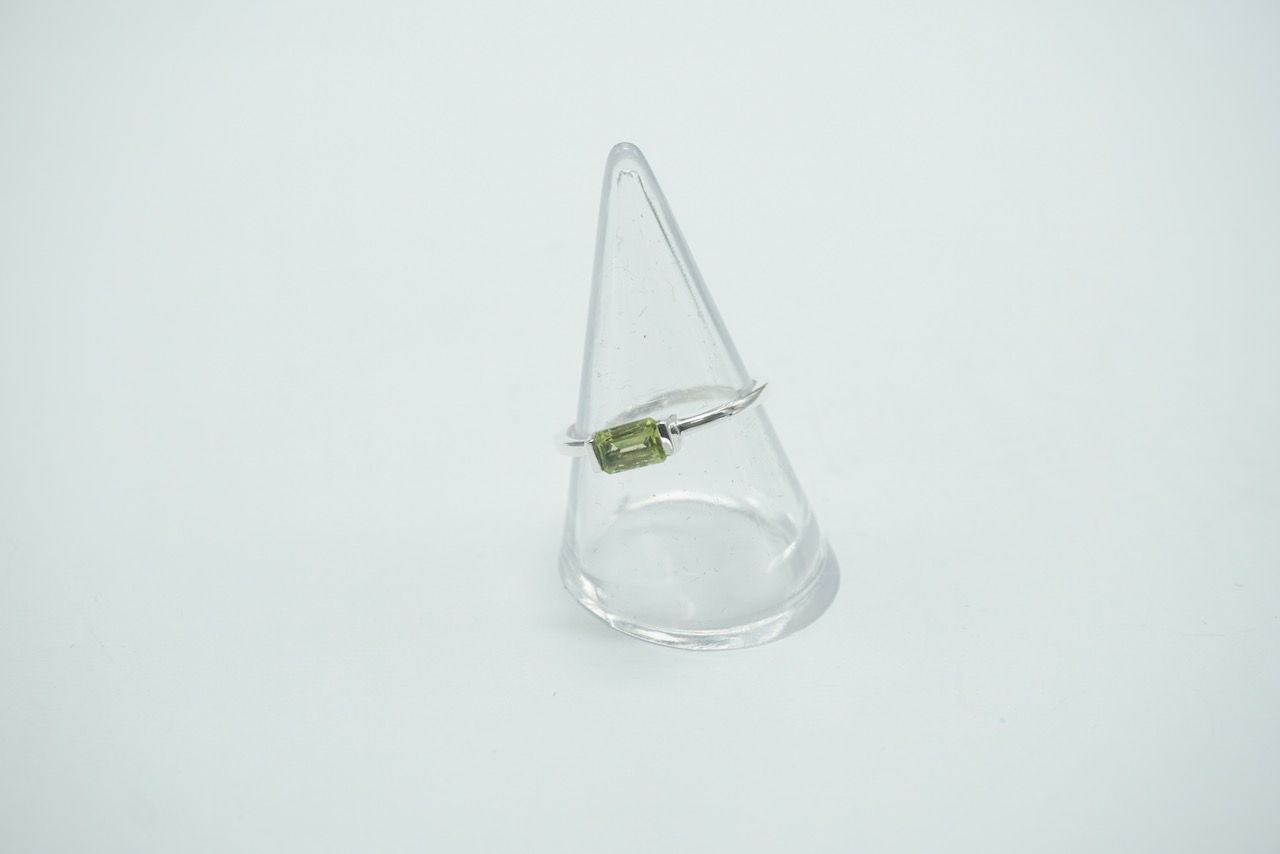 Cette fine bague en argent est sertie d’une pierre en Péridot.